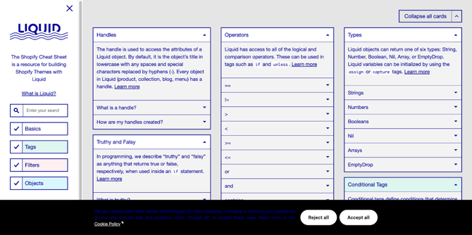 För att snabbt referera till Liquid syntax, kan du använda Shopify's Liquid cheat sheet.Om du som jag, inte heller är en utvecklare kan det vara ett välkommet hjälpmedel.
