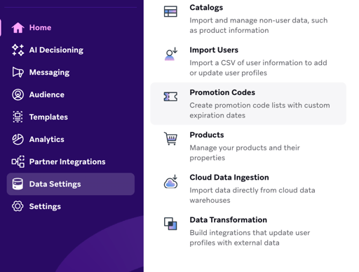Navigate to "Data Settings" > "Promotion Codes "